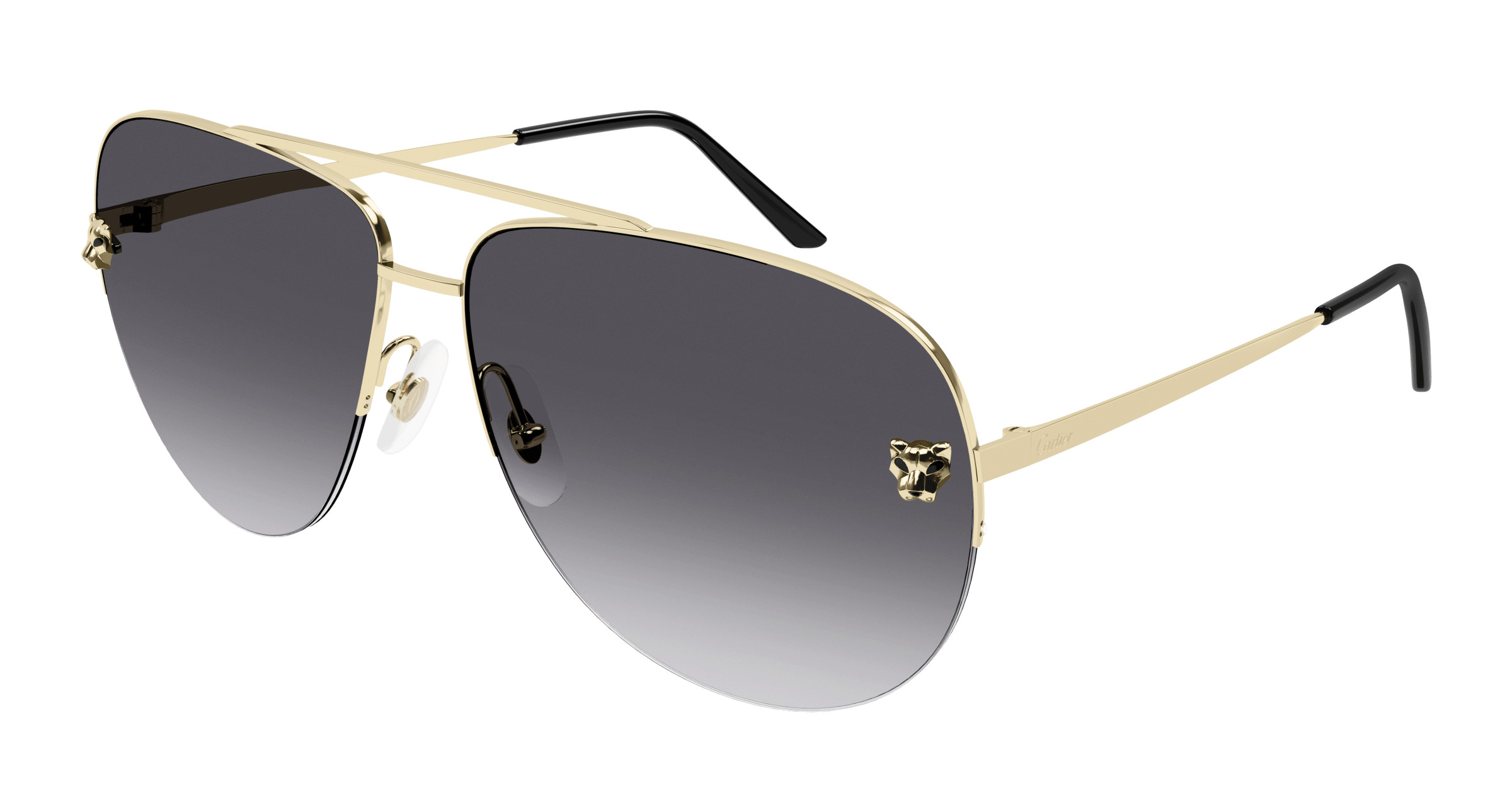 Timeless pilot shape, featuring the emblematic Panthère de Cartier for a very elegant and sophisticated design. Three-dimensions metal panther head sculptures with jewelry finishes: black lacquer for eyes and nose to recall onyx. Precious golden finishes adorning the décor and the bronze temples. Maximal comfort thanks to the temple tips, granting a soft and light sensation. Cartier logo engraved on the temples and Double C Décor signature on the nose pads.
