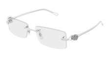 Precious bold Panthère execution in 18 ct solid adorned with over a hundred of precious stones. Elegant rectangular shape in rimless construction for the most sophisticated customer. Three dimensional Panthère head on the hinge decorated with 152 diamonds, 4 green tsavorite garnets on the eyes and hand-made enamel details on the animal's nose. Frame available in yellow, gold and rose solid gold 18 ct.